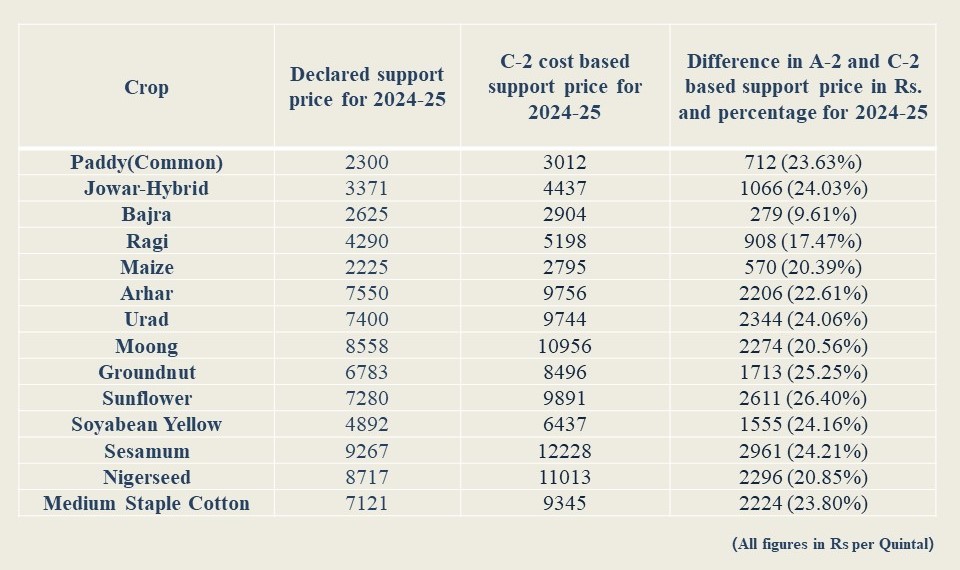 Despite the propaganda by the government and corporate media about a huge increase in the support price of Kharif crops, the reality is that these prices are far away from the actual support price based on C-2: for example, it is 23.63% less for common paddy, 24.03% less for jowar, 20.39% less for maize, 25.25% less for groundnut, 23.80% less for cotton. How painful it is for a common man to think that a farmer producing urad dal is paying a loss of Rs. 2344 per quintal, a farmer producing sesame is paying a loss of Rs. 2961 per quintal, or a farmer producing cotton is paying a loss of Rs. 2224 per quintal and investing in farming for 'nation service'! But this does not disturb the sleep of our Prime Minister.